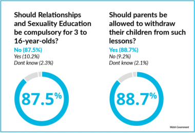 Of those who answered the Welsh Government’s question on whether RSE should be compulsory for 3 to 16-year-olds, 87.5 per cent said ‘No’. Barely 10 per cent said ‘Yes’.