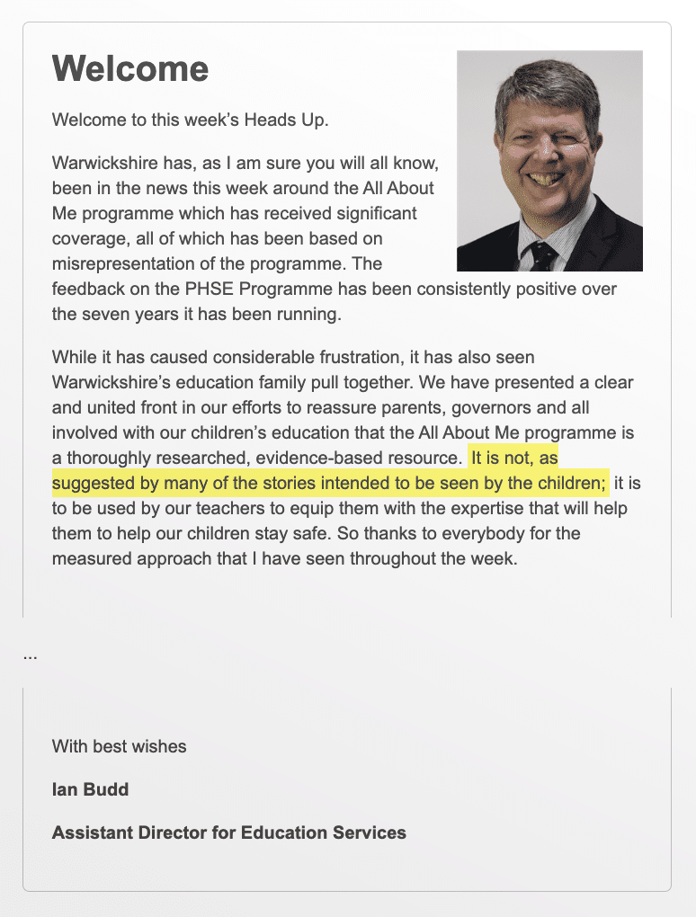 All About Me was drawn up by Warwickshire County Council (WCC) before the Government brought in the new statutory Relationships Education subject which becomes compulsory in September 2020.